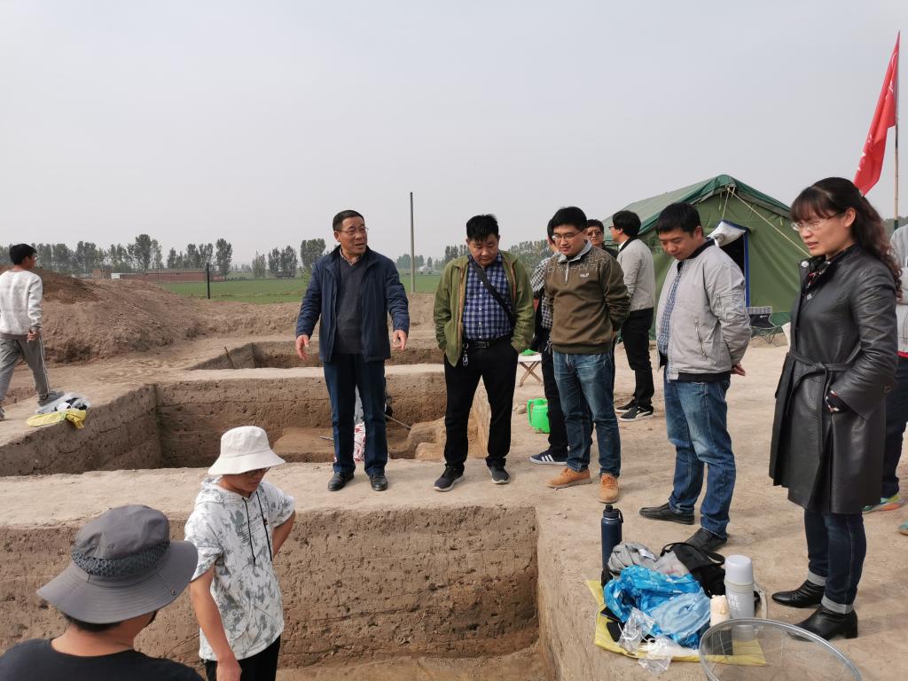 他们首先来到考古发掘工地。在现场,领队张立东老师向大家介绍了李固遗址概况,自2019年9月23日河大考古队进驻李固遗址开展工作以来,共有李丽娜、张玲、李彬森等多位老师以及来自学院各个年级的研究生、本科生近40人参与其中,他们克服了野外工地的环境不适、条件简陋、生活不便等各种困难,不舍昼夜,勤奋工作,已发掘面积约500平方米,发现墓葬、灰坑和房址等多处,出土陶片、石器、玉器多件,取得可喜的成果。