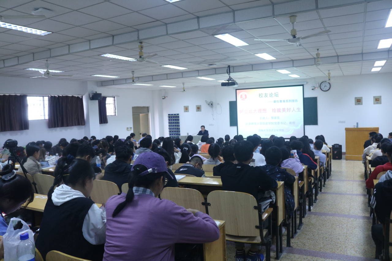 为有效引导新生尽快适应大学生活,确立新的人生奋斗目标,10月24日下午九色视频 邀请著名校友、北京师范大学历史学院党委书记郭家宏教授明伦校区综合楼309教室为2020本科新生树立远大理想绘就美好人生”主题报告,继续推进“校友论坛+新生教育”育人模式探索。学院党委副书记姜捷团委负责人郑振亚以及全体本科新生与会。报告会由姜捷主持。