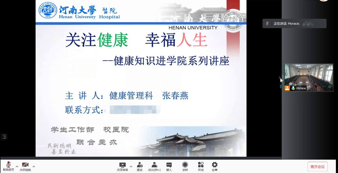 于9月15日下午以线上会议形式举行了2021级本科新生健康教育讲座,并邀请校医院健康管理科张春燕老师担任主讲人。讲座由2021级本科生辅导员郭浩老师主持。