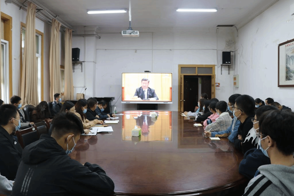 在三楼会议室组织集中观看在线直播,学院领导班子成员、党支部书记、行政各科室负责人、各年级辅导员、学生代表等人员参加。