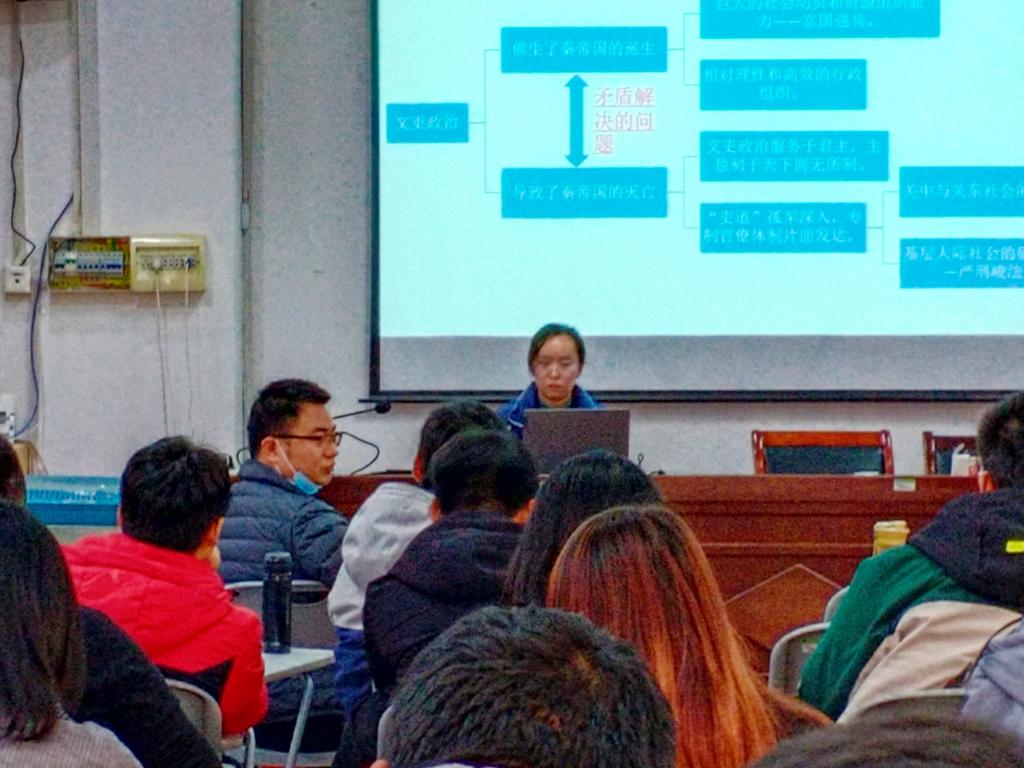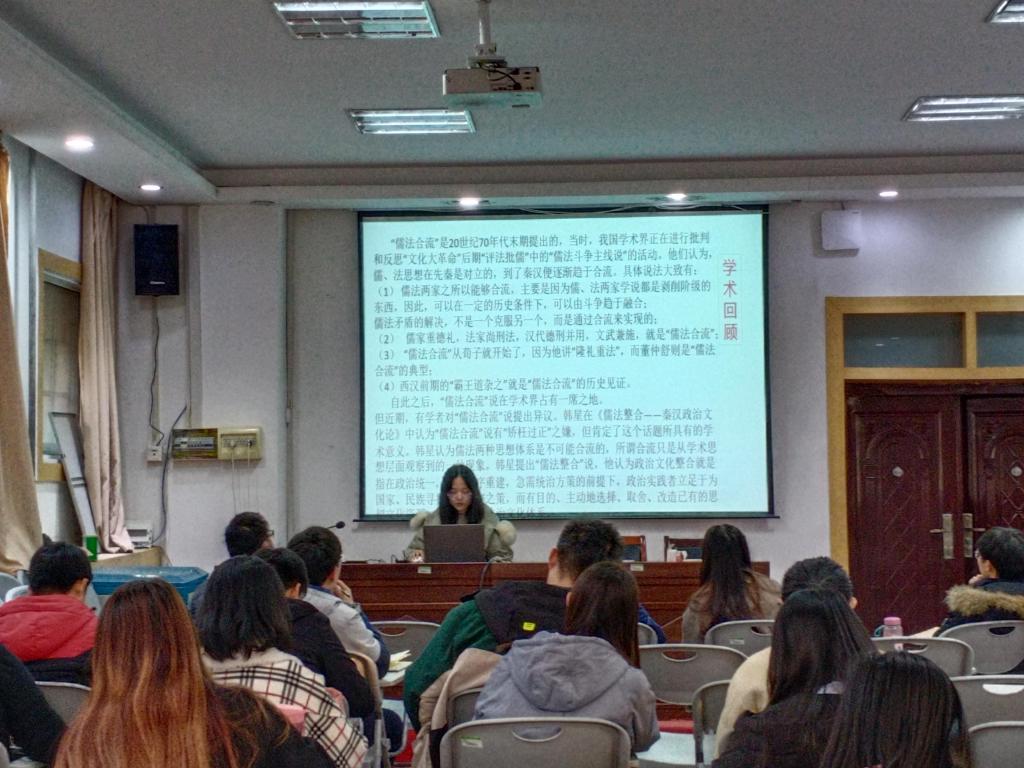 读书会以2019级黄滢宁所汇报的《秦的文吏政治》拉开序幕。她从“文吏政治”含义谈起,重点讲解了秦“文吏政治”的缘起、“文吏政治”的发展,并结合所知提出了关于“郡县与分封之争是‘法治’与‘礼治’的意识形态之争?还是单纯的制度之争?”的大胆猜测。接着,2020级张怡丹围绕《先秦政治思想史》中间部分汇报了题为《儒法融合的必然性探究》的小组读书心得。在进行学术回顾后,她从学派思想的融合、思想家的努力、社会政治的要求三个方面进行详细的说解,阐明儒法融合是历史发展的必然结果。2020级王茜以《浅谈韩非子人性好利说》为题进行了读书报告。在报告中她分析了韩非子人性好利说的表现、韩非子对人性好利的态度、韩非子人性好利说的意义。