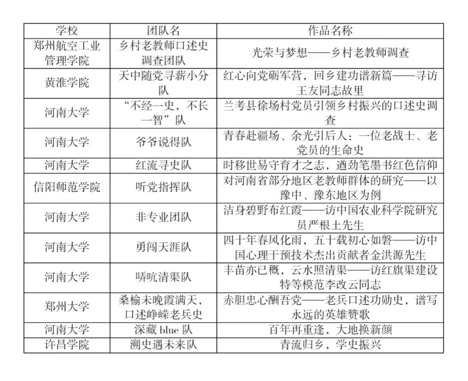 河南省第三届口述史大赛自2023年5月启动以来,收到了来自多所高校的五十余支队伍的口述史成果作品。经专家评议小组评议,12支队伍脱颖而出,入围决赛。现公布河南省第三届口述史大赛决赛入围名单(排名按团队名首字笔画数由少到多排序)及决赛相关事宜,请各参赛队伍知悉:
