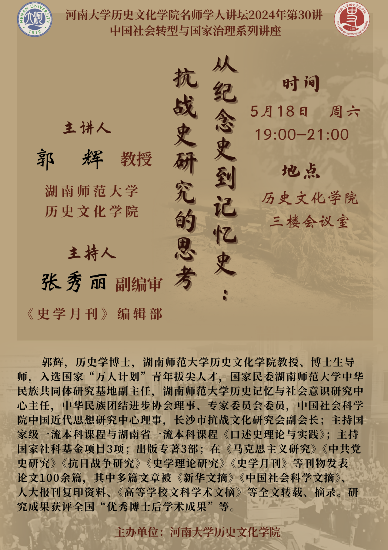 【讲座通知】郭辉:从纪念史到记忆史:抗战史研究的思考