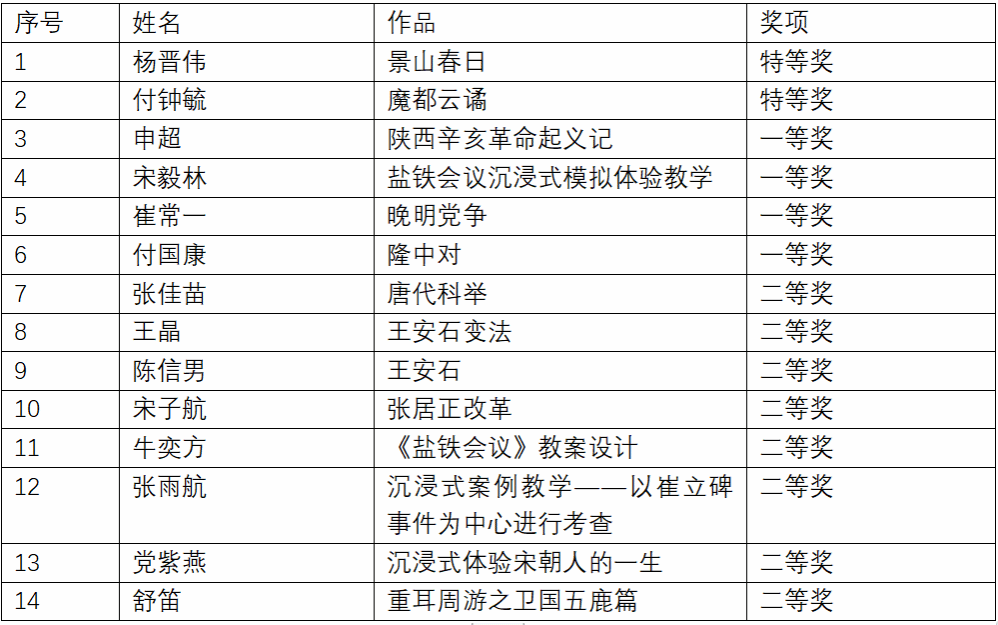 本次大赛反响热烈,五湖四海的青年学子、历史教师以及社会人士针对教学问题、结合实践经验,大胆创新、精密设计,贡献了各式各样的沉浸式历史教学案例。经过评委会审议,最终评选出特等奖2名、一等奖4名、二等奖8名(具体名单详见下表)。