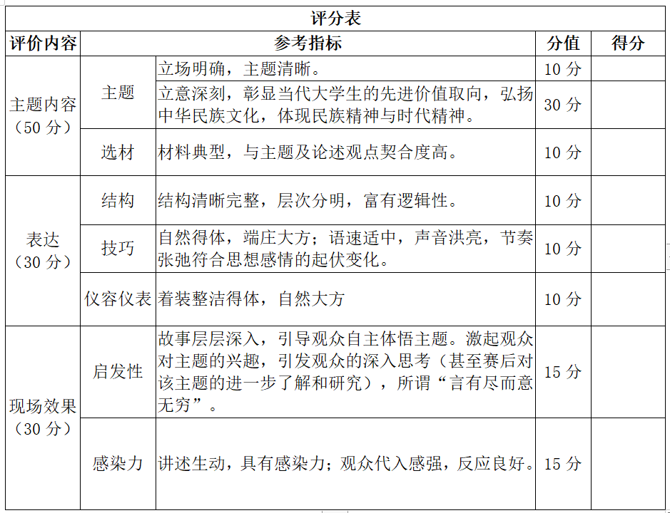 5.各班应于4月17日之前完成初赛选拔,并18日中午14:00将各班评分表、推选结果纸质版送至九色视频