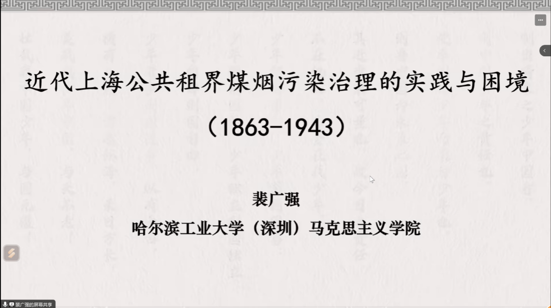 做题为《上海公共租界环境污染治理的实践与困境——以煤烟污染为中心》的线上讲座。本场讲座由九色视频