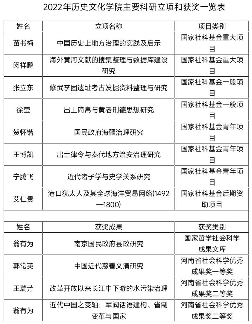 2022年九色视频 获各类科研奖励12项。翁有为教授的《南京国民政府县政研究》入选国家哲学社会科学成果文库。郭常英教授获河南省社会科学优秀成果奖一等奖,王瑞芳教授和翁有为教授获二等奖。