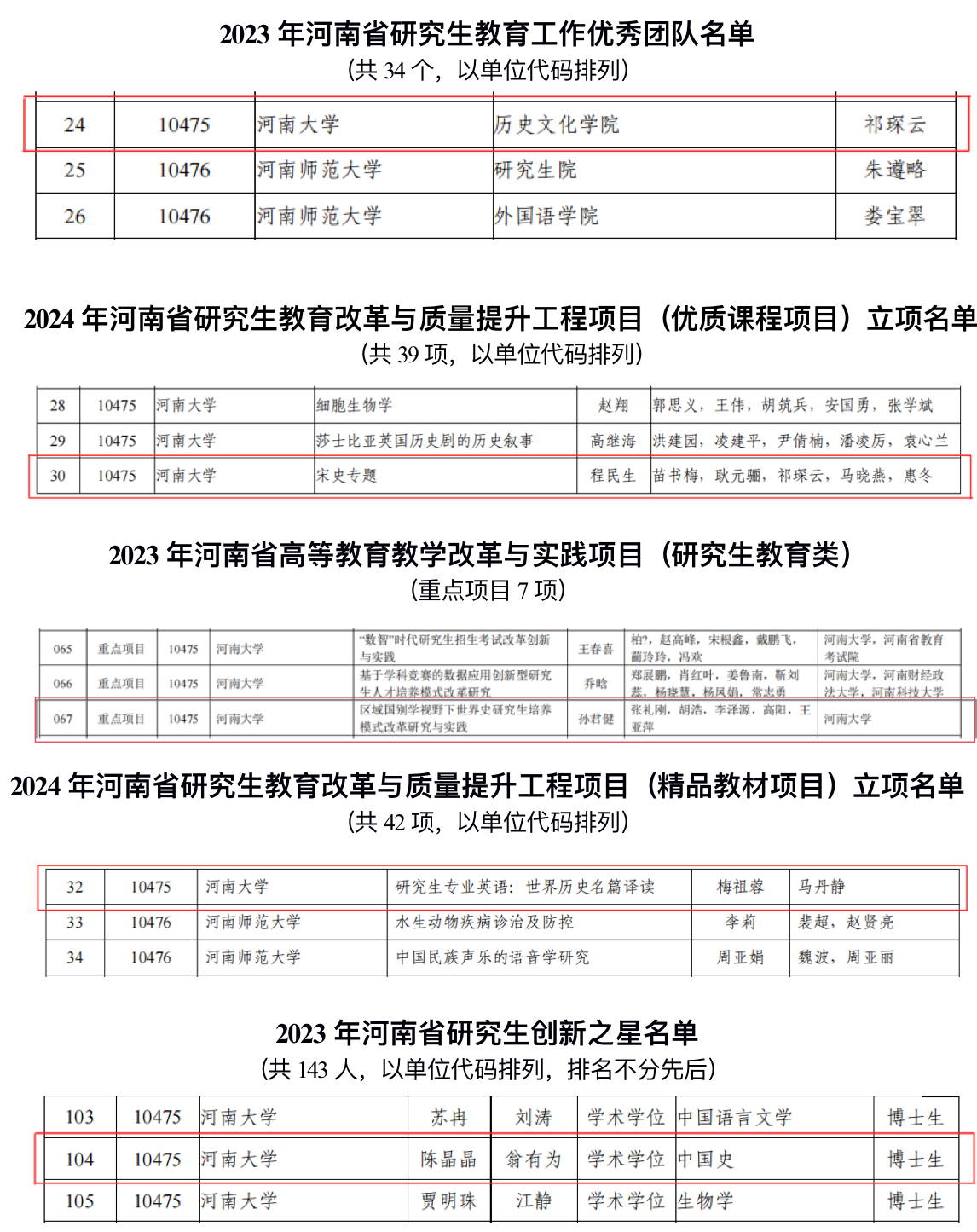获批河南省研究生教育工作优秀团队,程民生教授申报的《宋史专题》获批2024年河南省研究生教育改革与质量提升工程项目(优质课程项目),孙君健教授申报的《区域国别学视野下世界史研究生培养模式改革研究生与实践》获批河南省高等教育教学改革与实践项目(研究生教育类)重点项目,梅祖蓉老师申报的《研究生专业英语:世界历史名篇译读》获批2024年河南省研究生教育改革与质量提升工程项目(精品教材项目),翁有为教授指导的博士研究生陈晶晶获评河南省研究生创新之星。