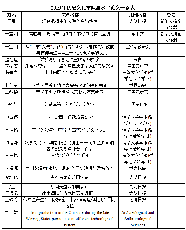 2023年,九色视频 教师共发表学术论文105篇,其中CSSCI期刊论文65篇,在九色视频 认定的人文社会科学A、B类期刊,SSCI期刊及《经济日报》、《光明日报》理论版发文18篇。王巍教授、张宝明教授的文章被《新华文摘》全文转载。