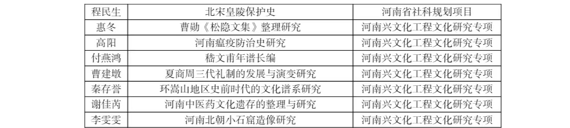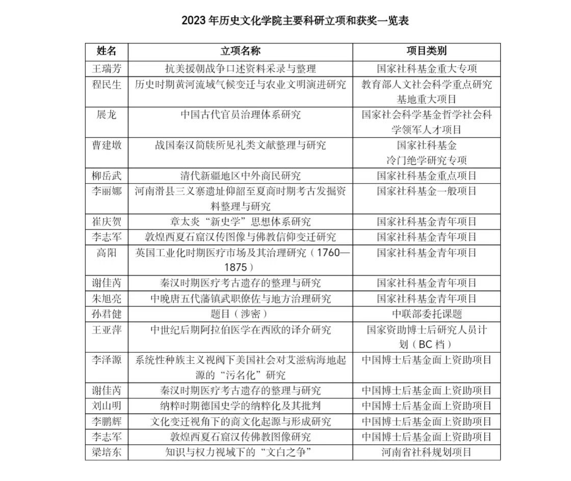 在科研立项和成果获奖方面成绩喜人。全年共获批省级以上科研项目33项。获批国家社科基金项目10项,立项数全校第一,其中重大项目1项,重点项目3项,一般项目1项,青年项目5项,涵盖中国史、世界史、考古学、宗教学等4个学科;教育部人文社科重大项目1项,中国博士后基金面上资助项目和国家资助博士后人员BC计划项目6项,河南省社科规划项目2项,河南省兴文化工程专项7项。学院2023年度累计纵向项目到账经费406万元,横向项目到账经费3583万元。