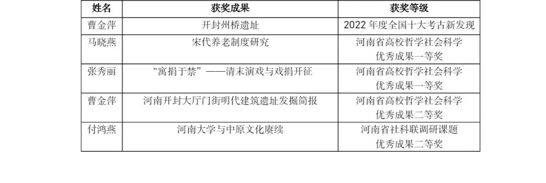 曹金萍老师参与发掘的开封州桥遗址,被评为2022年度全国十大考古新发现,马晓燕、张秀丽两位老师获河南省高校哲学社会科学优秀成果一等奖。