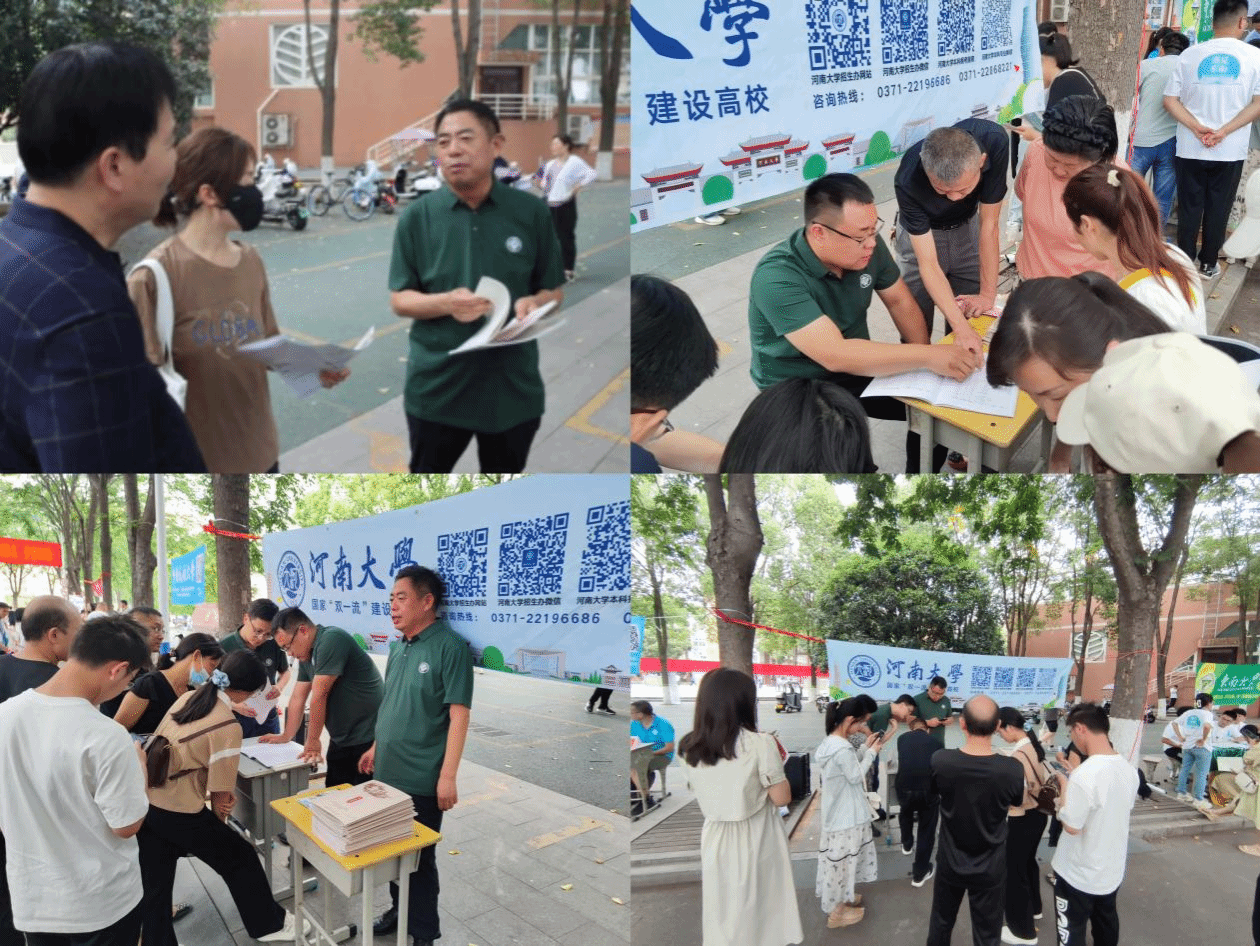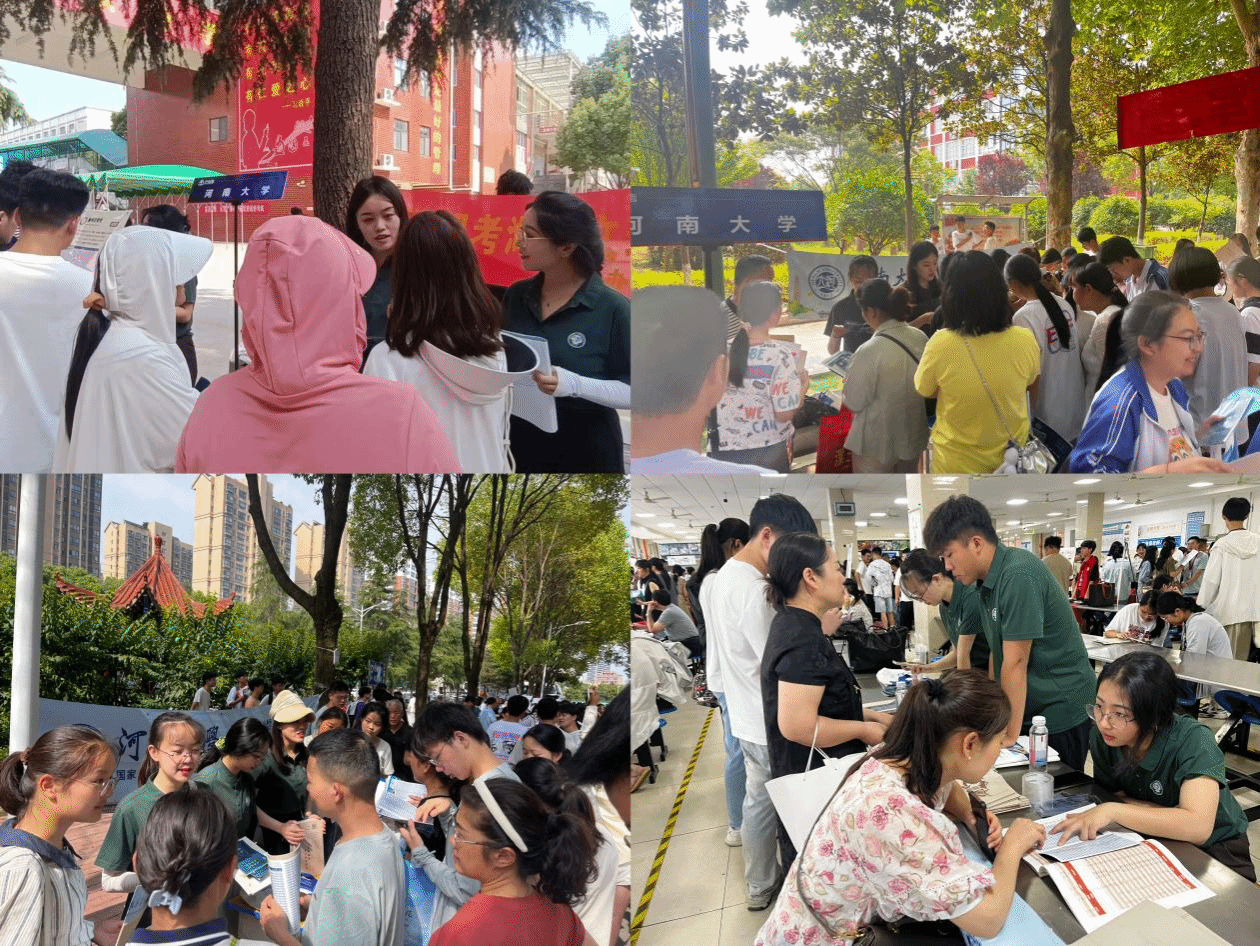 招生宣传组一组在南阳市第一中学、南阳市第五中学、南阳市第八中学和南阳市第二中学等四所目标中学设置招生宣传点,在各宣传点分发学校及学院宣传手册、招生简章及精美文创等材料,为前来咨询的考生及家长就志愿填报、专业解读等问题答疑解惑,向有意愿报考我校的学生介绍学校优势、师资力量、培养模式等具体情况。