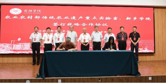 党委书记张占党与会议专家一同上台见证农业农村部传统农业遗产重点实验室副主任杨乙丹教授和新乡学院副校长韩辉教授代表双方签订战略合作协议。原河南省人大常委会副主任、省政协副主席袁祖亮教授,新乡学院党委书记孙功奇教授为中原农业文化遗产数智应用实验室揭牌。