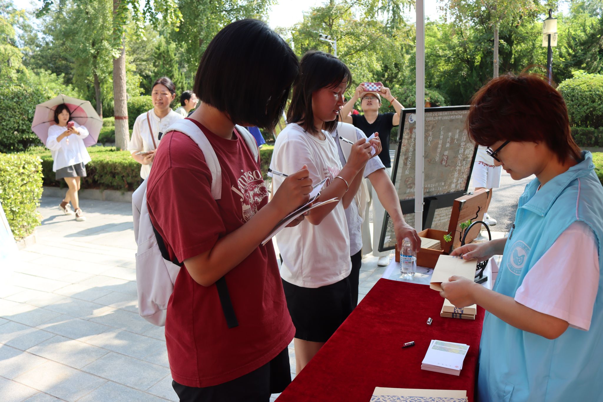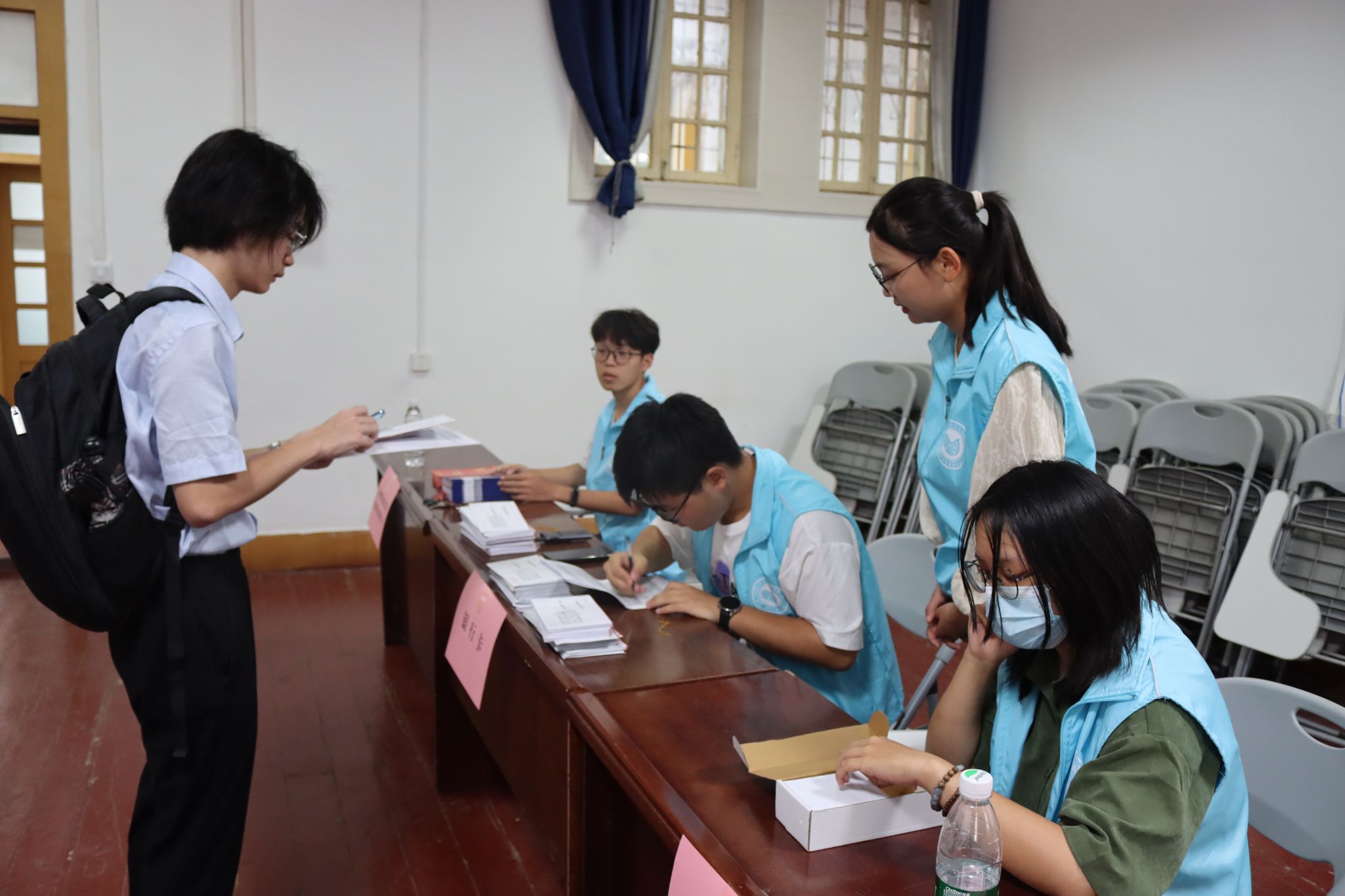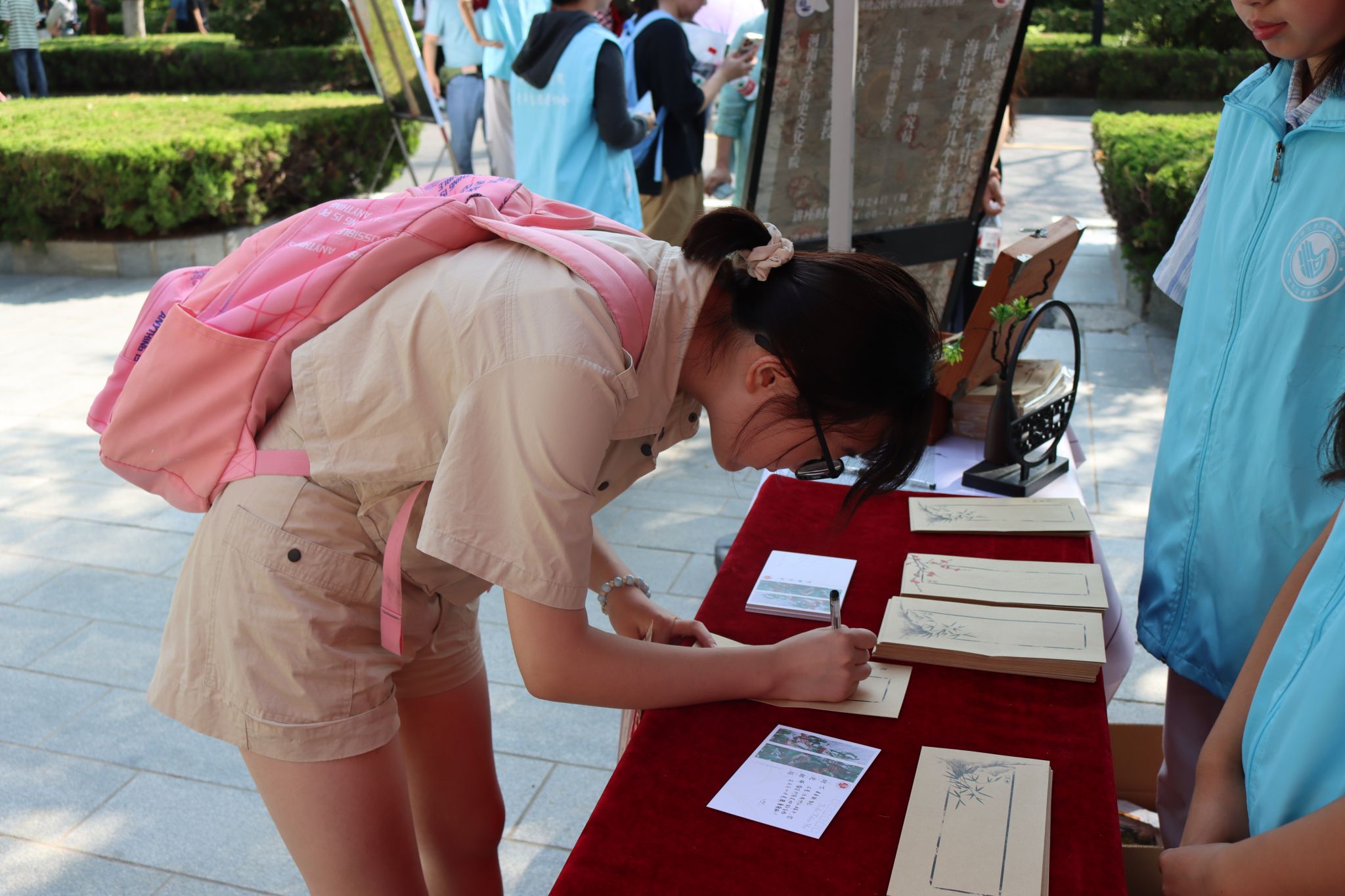 学院门前,同学们首先体验了本次迎新的特别活动——时光邮局,他们认真在明信片上写下对四年后的自己想说的话,再将它们用信封装好,由志愿者帮忙放回“信箱”中,静待四年后的花开。