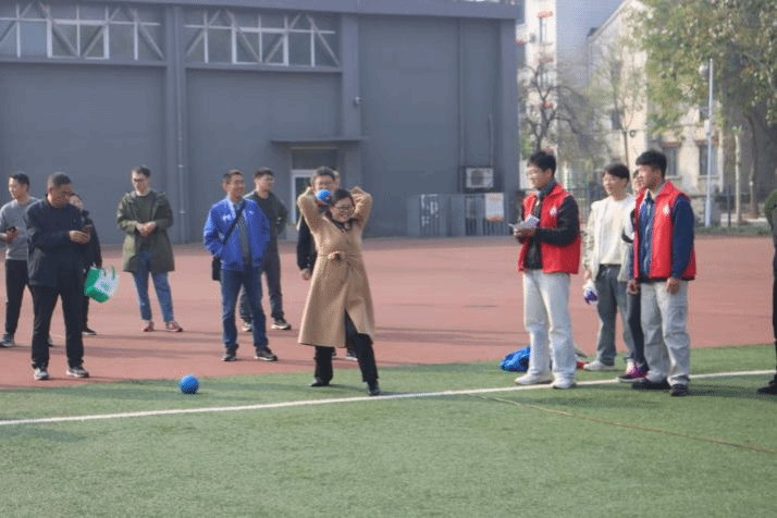 实心球比赛要求在瞬间发力,考验着参赛选上的爆发力。比赛前,老师们摩拳擦掌,跃跃欲试。上场后, 他们摆开架势, 深吸一口气,借着手臂力量与身体的惯性,用力把实心球推出。一番激烈角逐后,郑振亚老师和王娜老师分别获得了男女子实心球第一名。