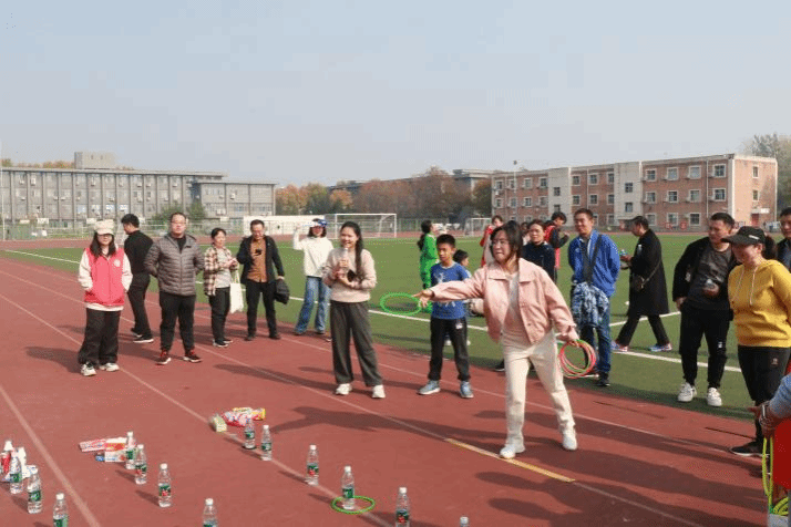 老师们拿着手里的彩色塑料圈跃跃欲试,一个个小圈被抛起又落下,唤起儿时的记忆。小朋友们也都参与进来,向前探出身子,努力把塑料圈套在矿泉水瓶上。在“大小朋友”的共同努力下,大家都获得了心仪的奖品。