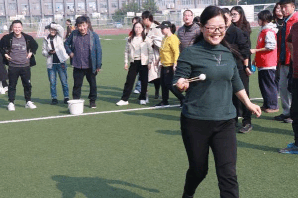 场上的老师,小心地夹起滑溜溜的乒乓球,放低重心,一边保持平衡,一边快步向终点走去。有时乒乓球一不小心掉在桶边,一时着急,却怎么也夹不进去。一番耐力与专注力的较量之后,最终夹起8个球为本项目的最好成绩。