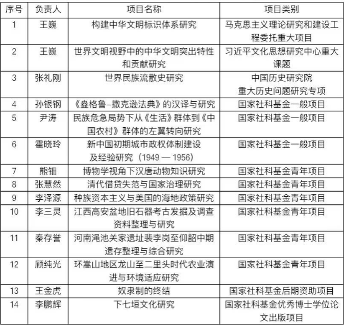在国家社科基金申报工作中取得突出的成绩,共获批国家社科基金项目14项,其中国家重大项目3项,国家社科基金年度项目9项(一般项目3项,青年项目6项,涵盖中国史、世界史、考古学、党史·党建等4个学科),国家社科基金后期资助项目1项,国家社科基金优秀博士学位论文出版项目1项,立项数量创历史新高。
