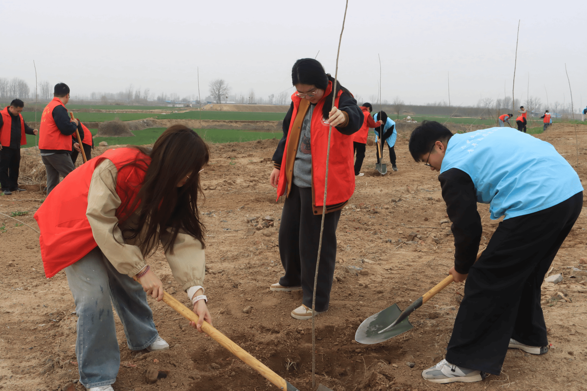 习近平总书记强调:“植树造林是实现天蓝、地绿、水净的关键途径,是最具普惠性的民生工程。”在新乡市封丘段黄河大堤,师生代表与封丘河务局机关第一党支部联合开展了植树造林活动。在河务局工作人员的指导下,植树活动采取三人一组,双线并进的模式,一名同学负责扶正树苗,确保其垂直种植;另外两名同学则使用铁锹铲土填坑并压实土壤,分工明确,协作默契。在师生的共同努力下,原本荒芜的土地被林立的300棵树苗所覆盖,焕发出勃勃生机。参与植树的娄洞梁同学表示“通过参加植树活动,与同学挥锹培土时,突然懂得每株树苗都是绿色生命的诺言,生态文明建设不是口号。我十分乐意以实际行动践行绿色发展理念,弘扬志愿服务精神,为黄河流域生态保护贡献自己的力量。”