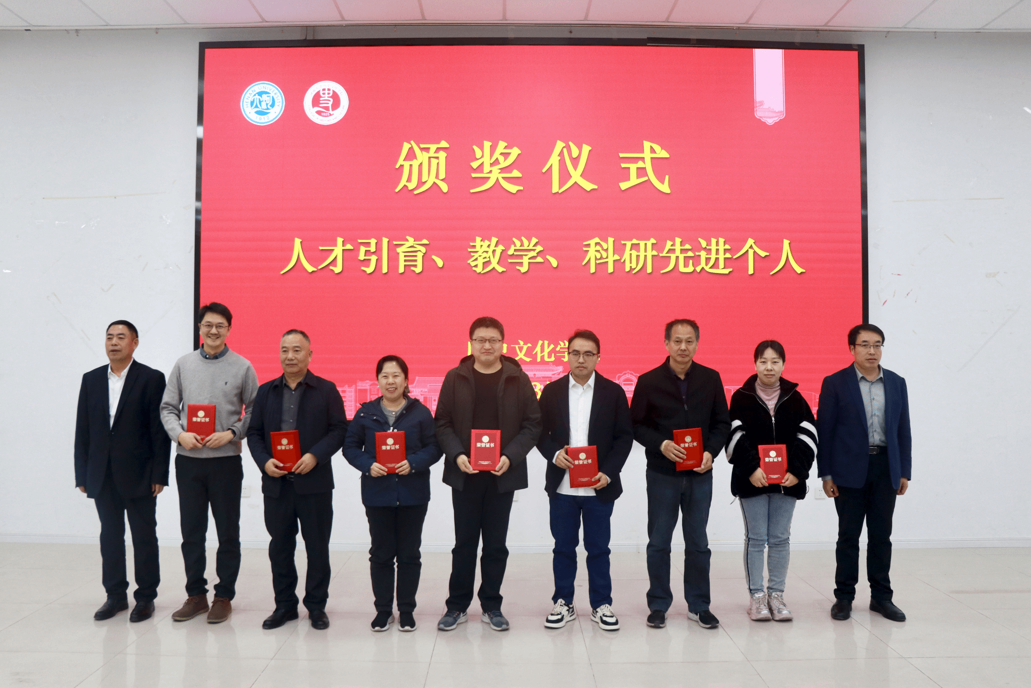 关于表彰2024年度科研先进个人的决定》文件,受表彰教师代表上台领奖并合影留念。