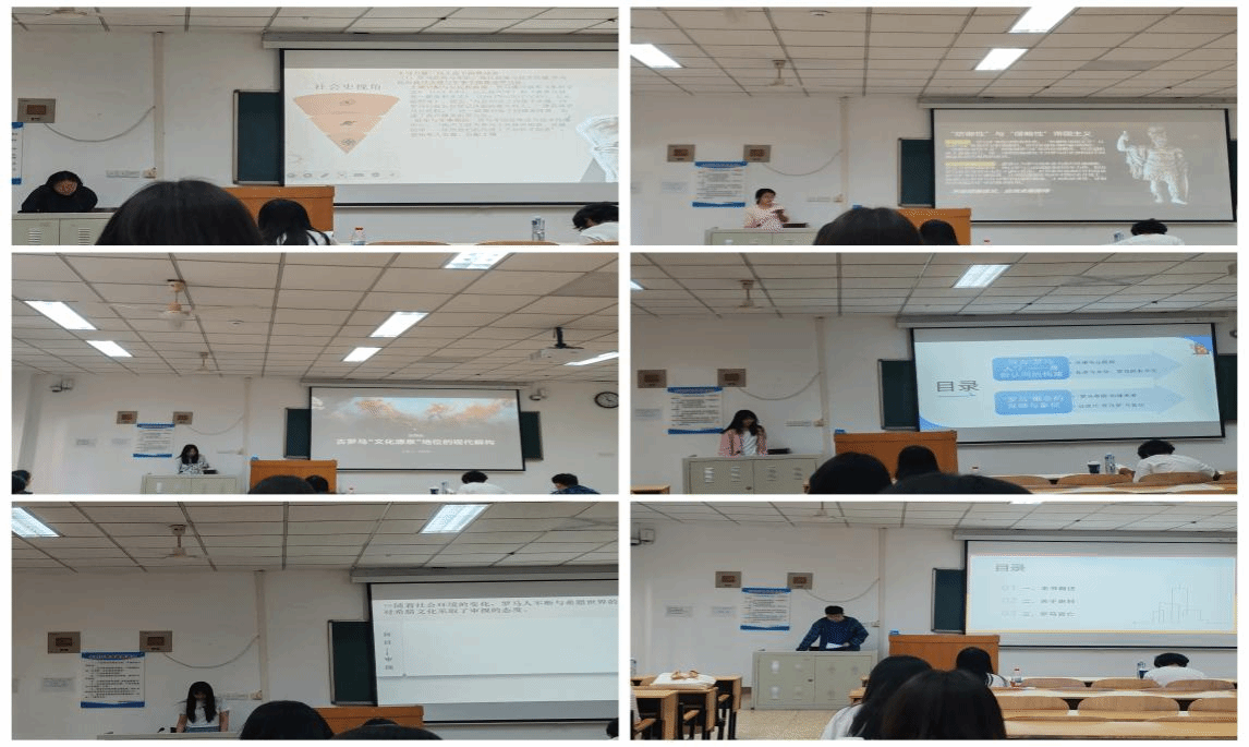 参加读书会的同学分六组作读书汇报。第一组付崇彧同学从史料入手,具体梳理了导致西罗马帝国灭亡的著作因素,如政治腐败、经济衰退、军事危机与蛮族入侵等。第二组侯新月同学讨论了希腊文化与罗马文化之间的关系,认为罗马文化继承并创新了希腊文化成果;围绕“面纱下的他”介绍了屋大维,安东尼等重要历史人物。第三组卢秀辉同学立足“罗马人身份认同的构建”和“罗马概念的延续与象征”两个方面,讲述了罗马的思想认同和文化认同,扩展到近现代“罗马梦”与象征。第四组赵悦彤同学集中论述古罗马“文化源泉”地位的现代解构,讲述了罗马文化的多元底色,探究了“希腊化罗马”还是“罗马化希腊”的问题。第五组周欢宇同学通过对比不同学者观点,比如“防御性”与“侵略性”帝国主义,列举了蒙森等学者观点,引发了郑储双等同学不同角度的深度思考。第六组邓宇涵从社会与生活史角度看待罗马化问题,分别以婚姻、宗教、语言的切面分析社会中的罗马化推动力量,对罗马化进程中的身份认同、文化协商等进行总结。