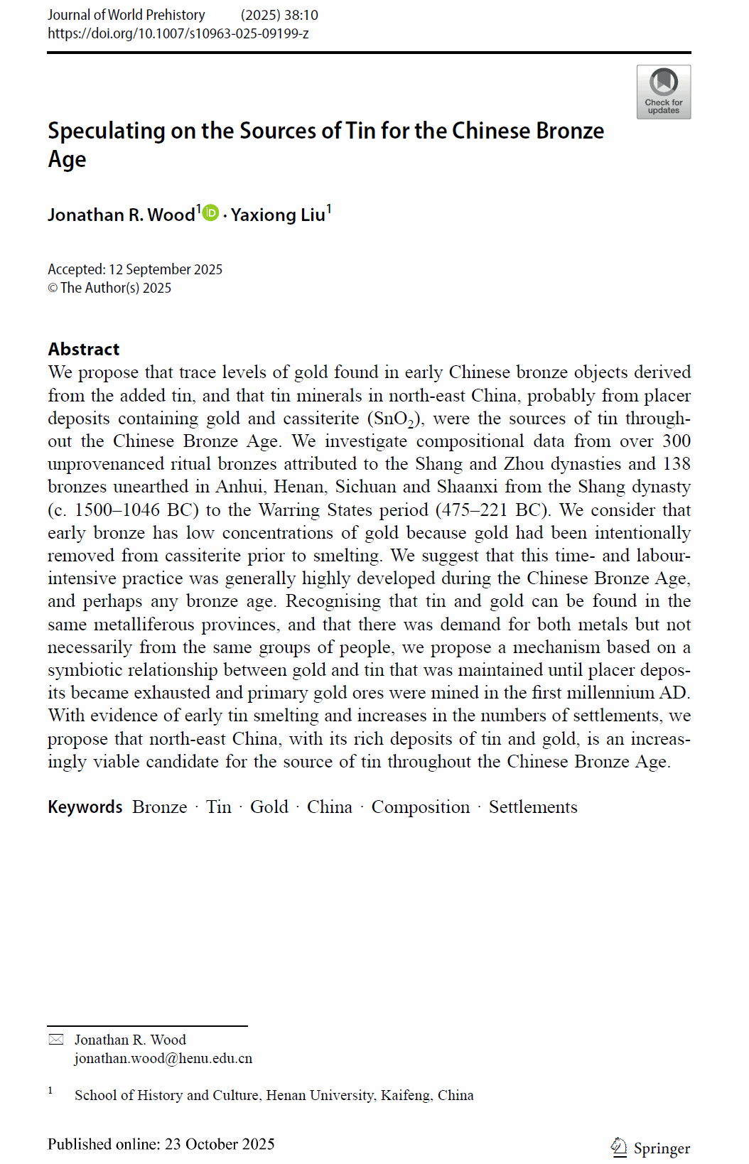 外籍教师Jonathan R. Wood教授研究成果在国际顶尖考古学期刊Journal of World Prehistory期刊上发表。该研究提出关于中国青铜时代锡料来源的新假说:中国青铜时代的锡料可能主要来自东北地区的砂锡矿,锡料中残留的微量金元素揭示了古代矿工复杂的资源管理策略。该项研究为理解青铜时代资源流通与社会发展提供了全新视角。
