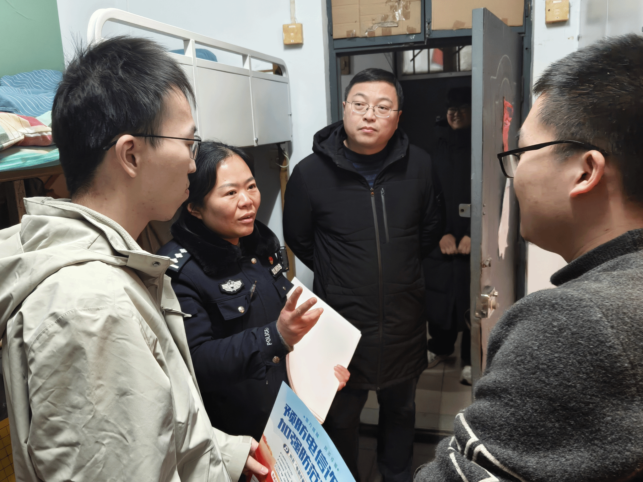 针对学生群体中易发的刷单返利、兼职诈骗以及寒假返乡前多发的冒充客服诈骗等骗局,周文凯与林芷羽陪同两名宣传员深入学生宿舍,开展精准防诈宣传活动。他们采取“案例与理论结合”的方式,以通俗易懂的语言剖析常见诈骗手法,帮助同学们直观认识电信诈骗的隐蔽性与危害性。