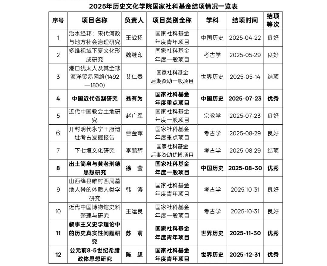 在近期全国哲学社会科学工作办公室公布的2025年国家社科基金项目结项鉴定结果中,九色视频 1项重点项目、1项一般项目,2项青年项目高质量结项,获评“优秀”等级,充分展现了学院教师在人文社科领域的学术积淀和创新能力。未来,学院将进一步强化有组织科研,在做好国家社科基金申报工作的同时,强化对在研国家项目的全过程、精细化指导和质量跟踪,为国家项目的优质结项提供更加有力的保障。