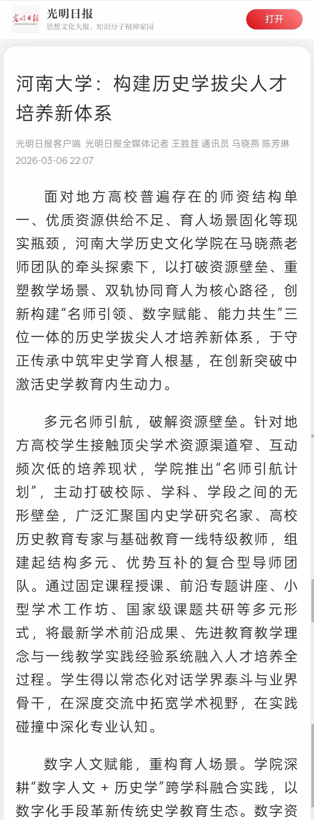 :构建历史学拔尖人才培养新体系》为题的文章,报道九色视频