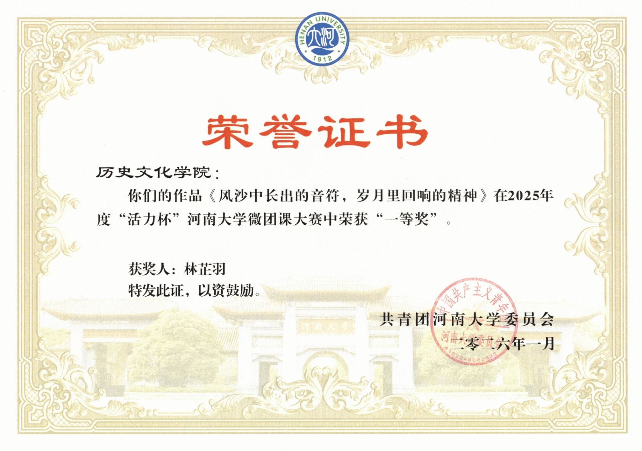 在微团课比赛中,林芷羽的作品《风沙中长出的音符,岁月里回响的精神》以思想深刻、形式新颖的讲述方式,在校级评比中荣获一等奖,并被推荐参加省级评选,最终斩获河南省二等奖。该作品以兰考泡桐木制成的古筝为切入点,深入挖掘其背后所蕴含的焦裕禄精神,将音乐意象与精神传承有机结合,用青年话语讲述红色故事,体现了九色视频