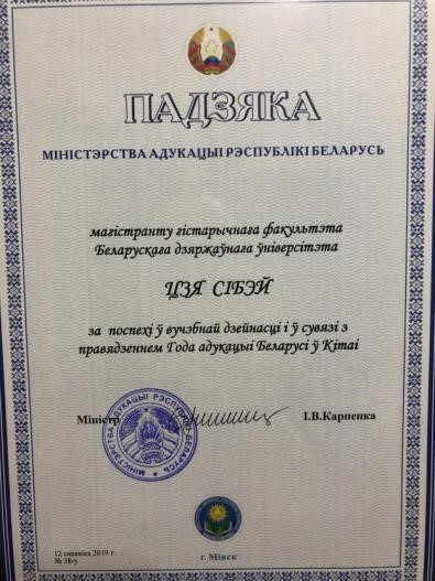 2019年3月,贾茜贝同学获得了由白俄罗斯教育部颁发的年度优秀学习奖。2019年是中国与白罗斯“中国教育年”,在此主题框架内,明斯克举办了一个特别的奖项颁发仪式。