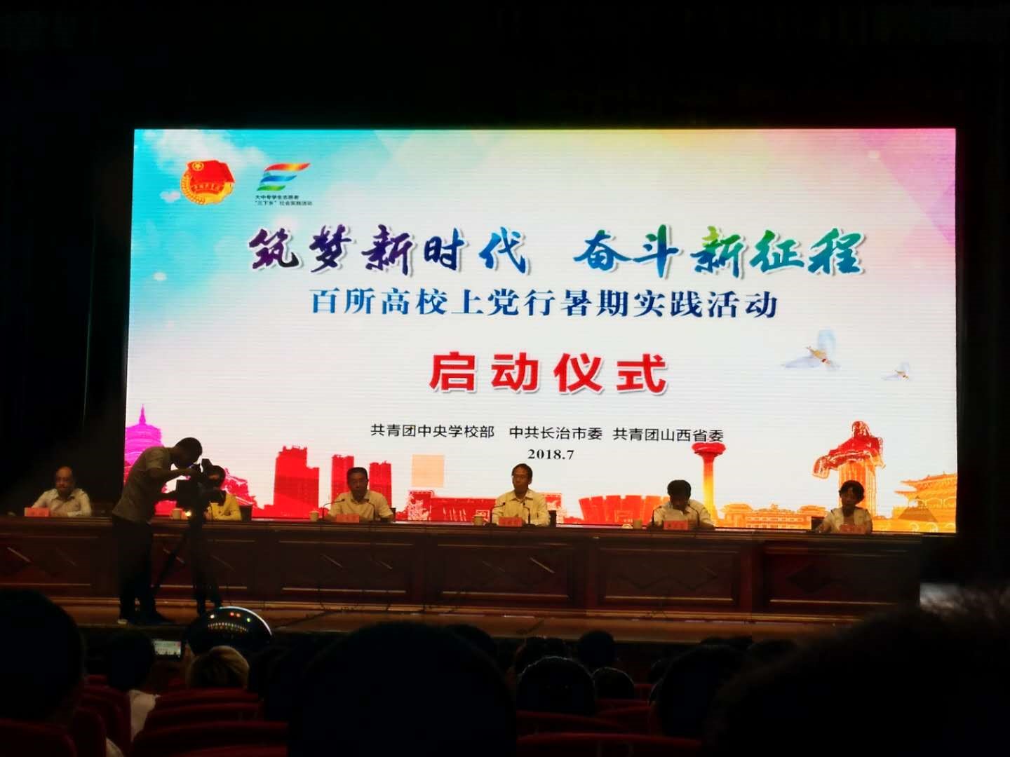 抵达长治市后,实践团队于上午九点在长治市的潞州剧院参加了长治市的“筑梦新时代,奋斗新征程”百所高校上党行暑期社会实践活动的启动仪式。仪式上,首先由实践团队队员代表--北京大学任宇航发言,之后是课题单位代表--壶关县委副书记孙伟发言,第三项是团中央学校部副部长石新明讲话,第四项是市委书记孙大军讲话,第五项是团中央学校部、中共长治市委、团省委领导为实践团队授旗,最后各领导共同按下启动球开启实践活动。其中市委书记孙大军对各实践团队的到来表达了热烈的欢迎和衷心的感谢,同时希望各团队在接下来的几天内,能够走进长治,感受长治,服务长治,深入基层一线,将课堂理论与实践结合,共建美好长治。
