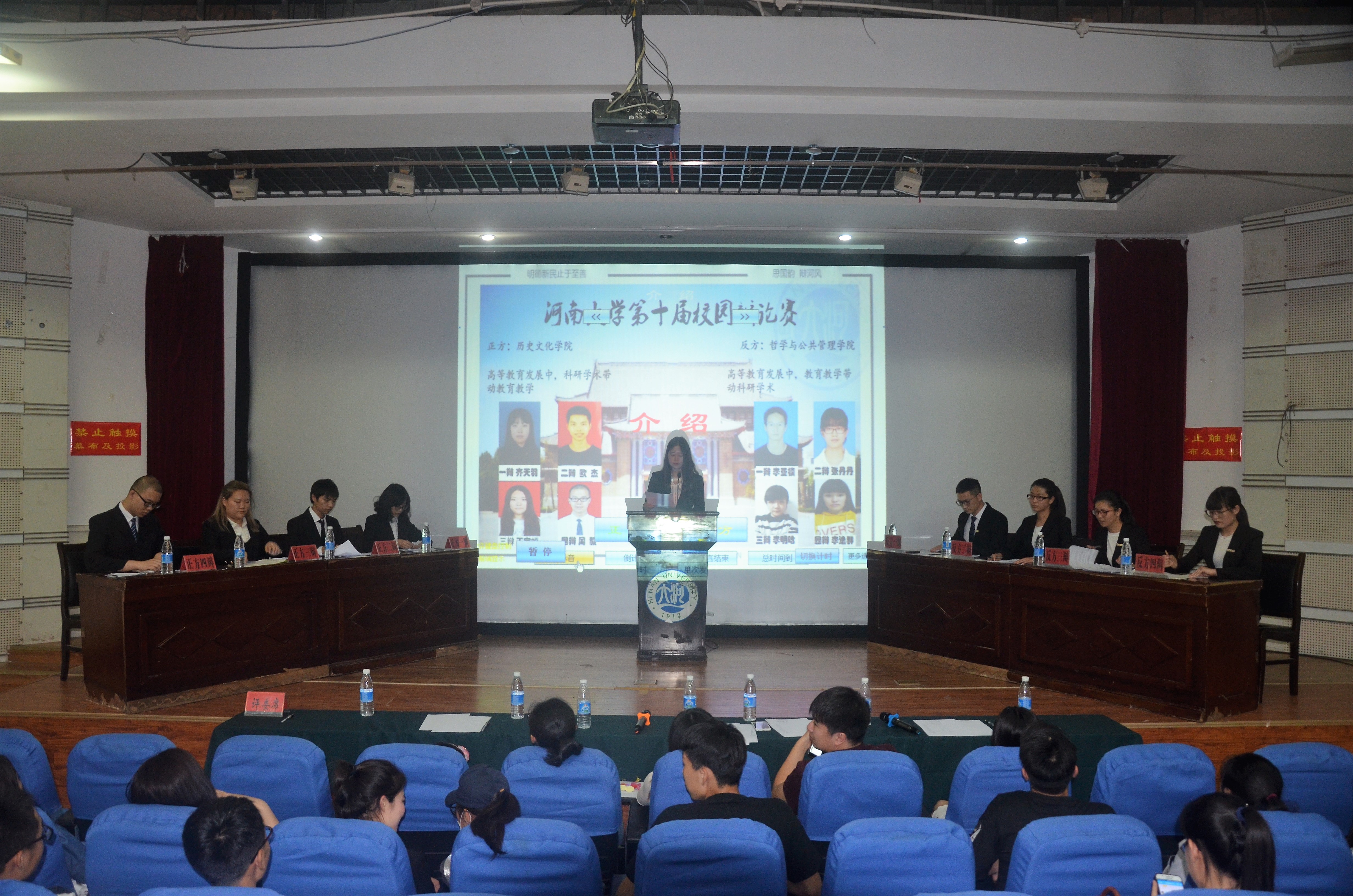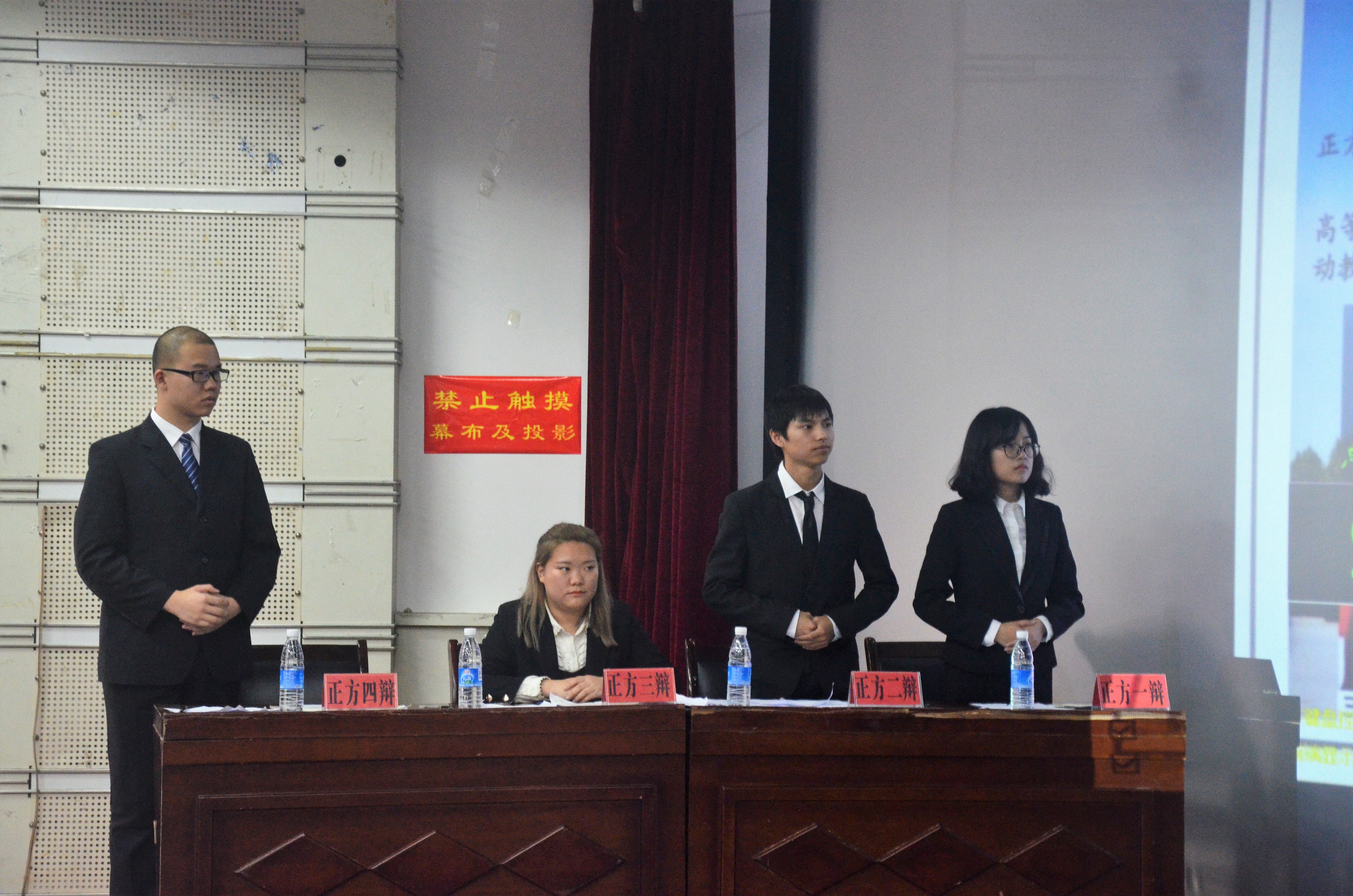 辩论队和哲学与公共管理学院辩论队之间展开,双方围绕高等教育发展中,科研学术带动教育教学还是教育教学带动科研学术展开了激烈的辩论。比赛开始前,主席介绍了比赛规则以及注意事项,并演示了比赛中的提示音。
