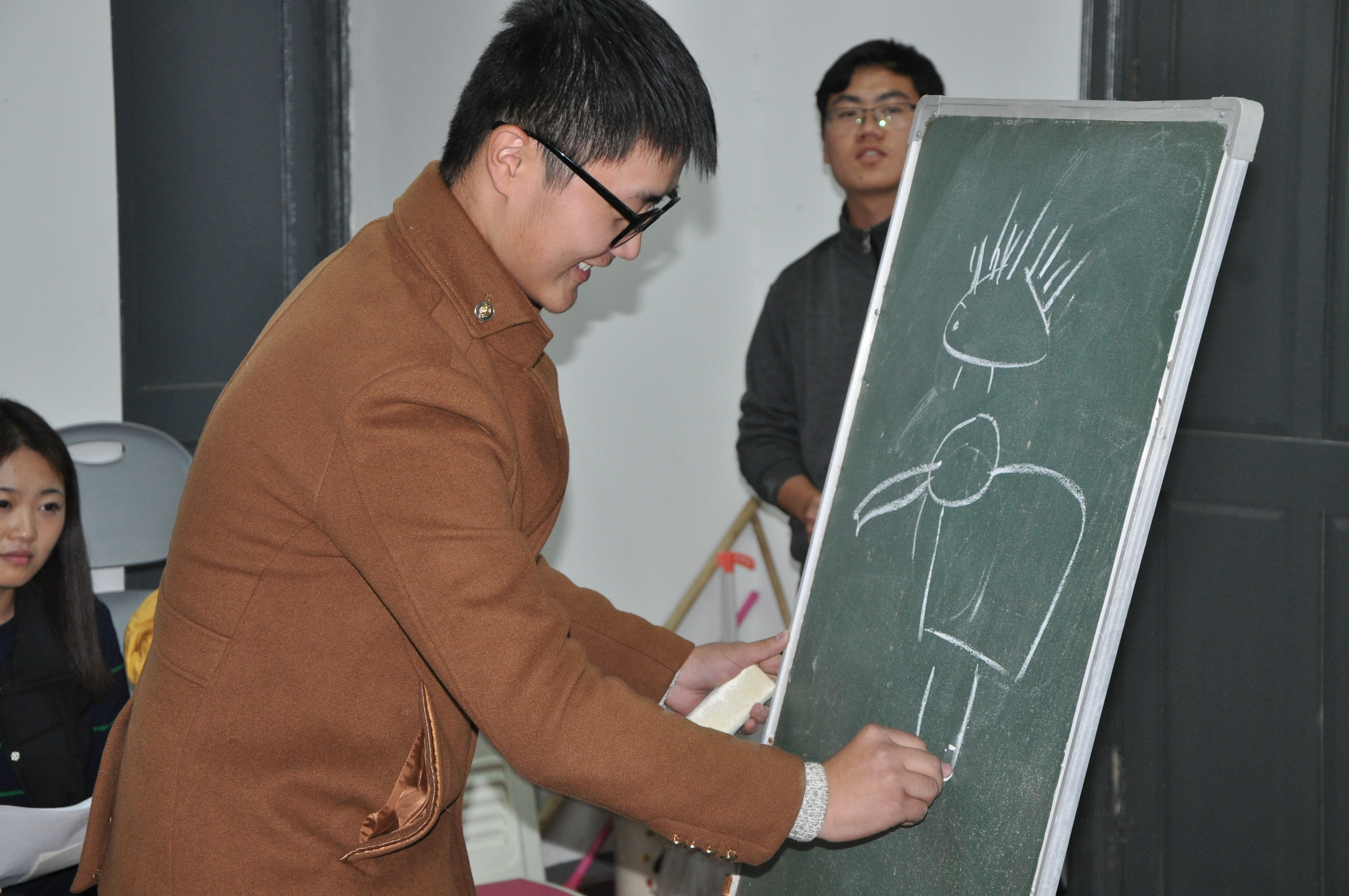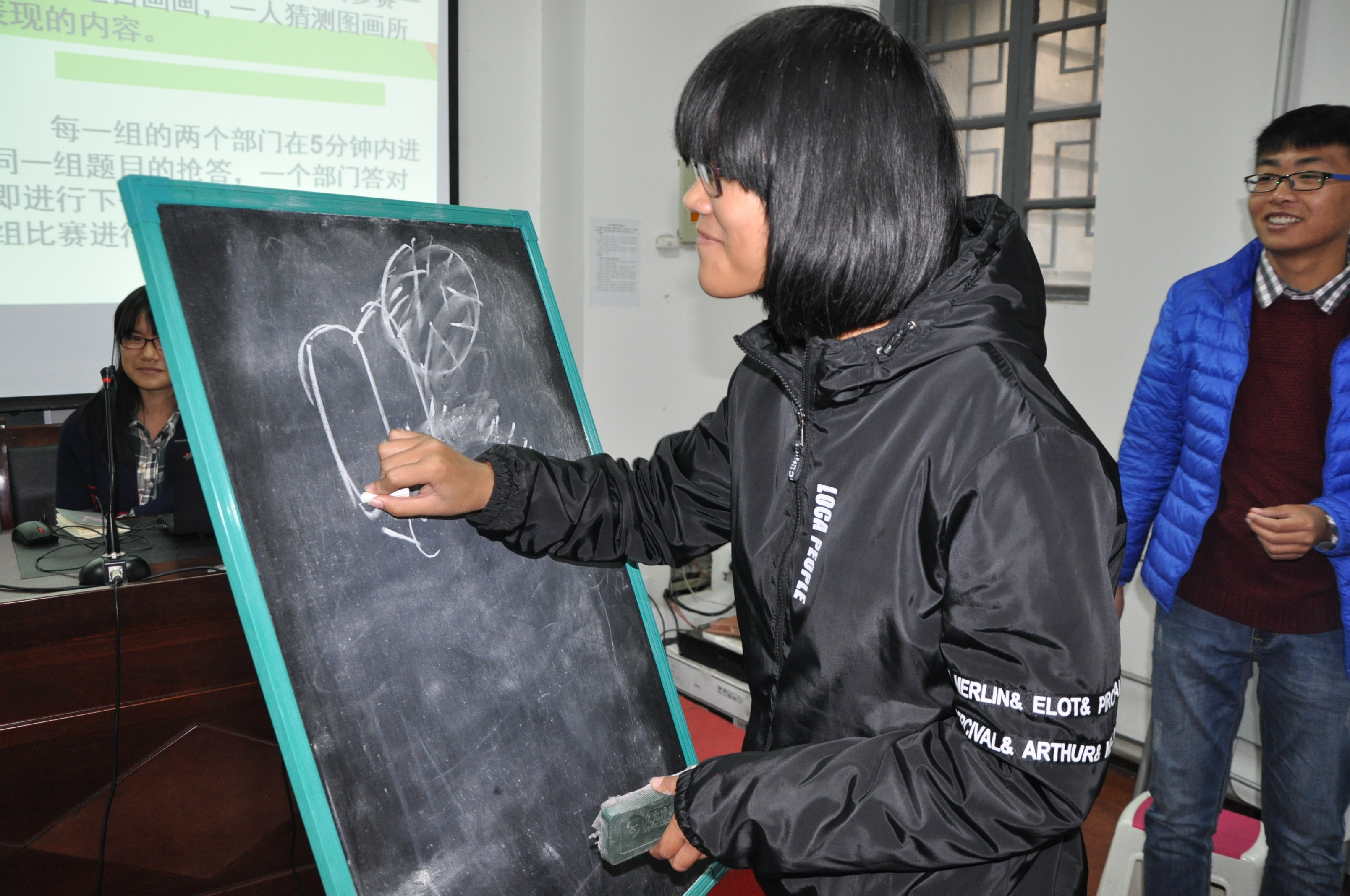 第三个环节“心有灵犀”是最考验大家默契的环节,每个部门需要派出5名成员,站成一排,由最后一名同学画出自己看到的答案,依次传递给前一名同学,分别作画,最后由第一名同学报出答案。比赛过程中不时传来同学们的加油声和欢呼声,即使是窗外寒风呼啸,阴雨绵绵,也抵挡不住大家的热情。通过这个环节,各部成员的集体意识,协作意识都有了较大的提高。