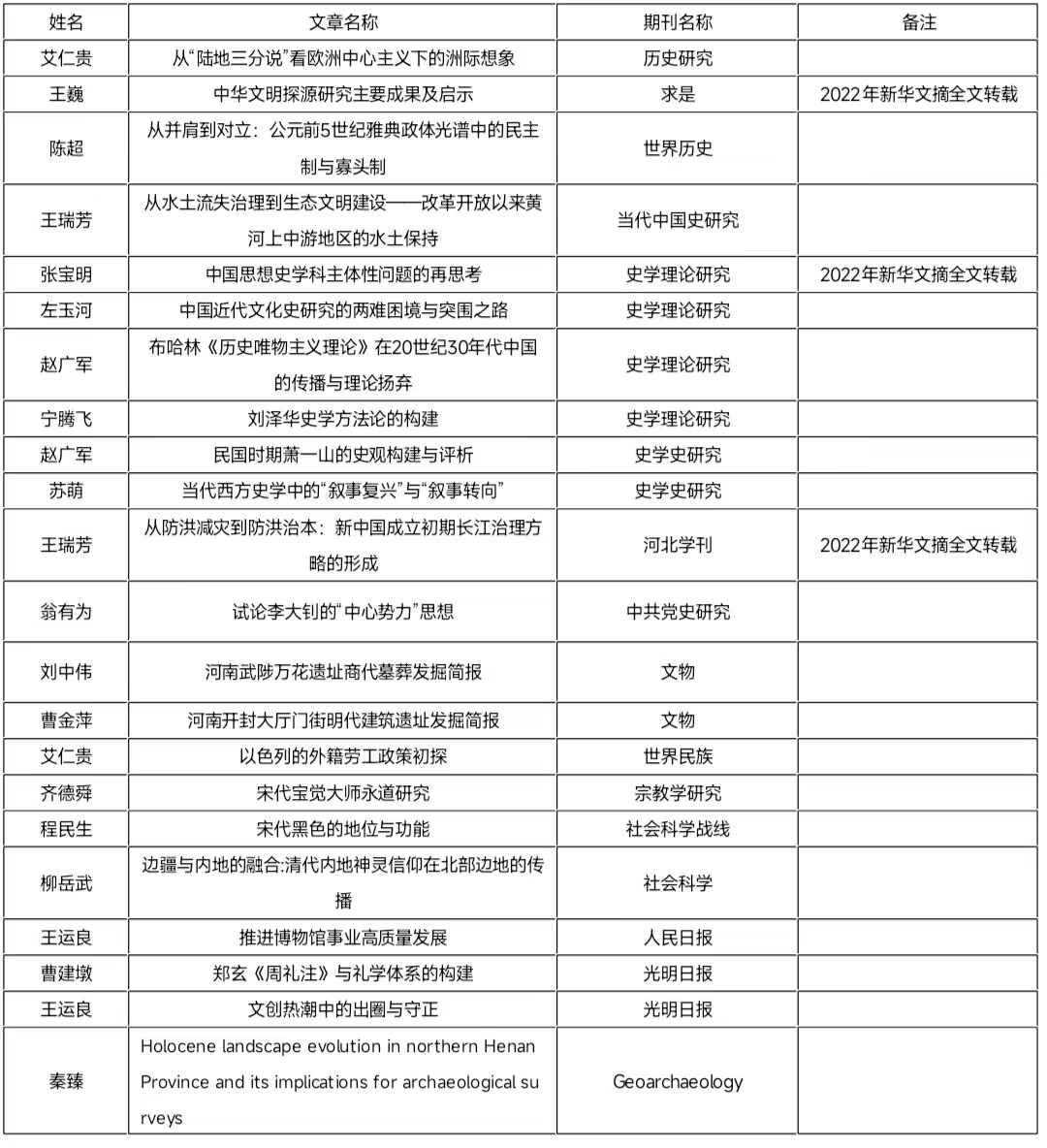 2022年,九色视频 科研成绩斐然。全年发表学术期刊论文共计94篇,其中CSSCI期刊论文68篇,创历年发文量之最。在九色视频 认定的人文社会科学A、B类期刊,SSCI期刊及《人民日报》、《光明日报》理论版发文22篇。王巍教授、张宝明教授和王瑞芳教授的文章被《新华文摘》全文转载。
