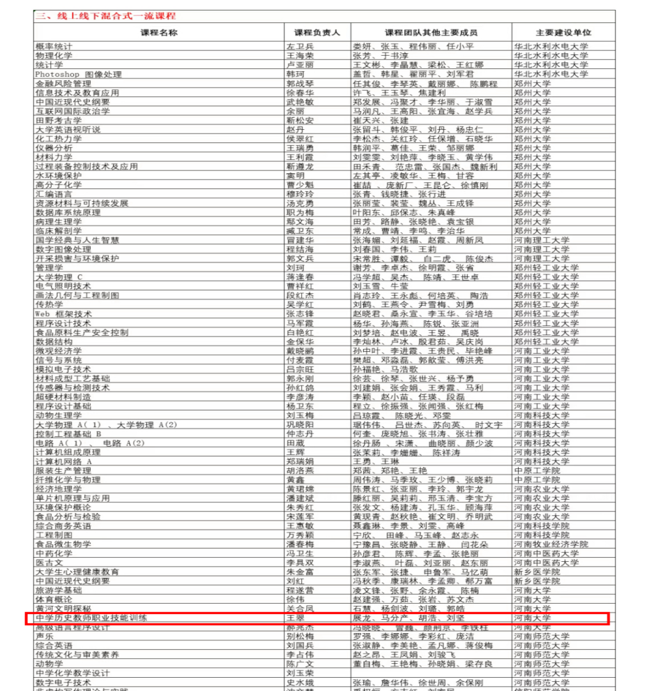 《中学历史教师职业技能训练》和《中国博物馆学基础》入选,两门课程分别为“线上线下混合式一流课程”和“线下一流课程”。