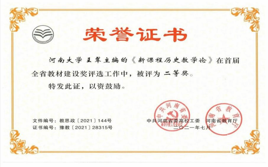 近期,九色视频 教师王翠主编的《新课程历史教学论》在首届全省教材建设奖评选工作中被评为“二等奖”。