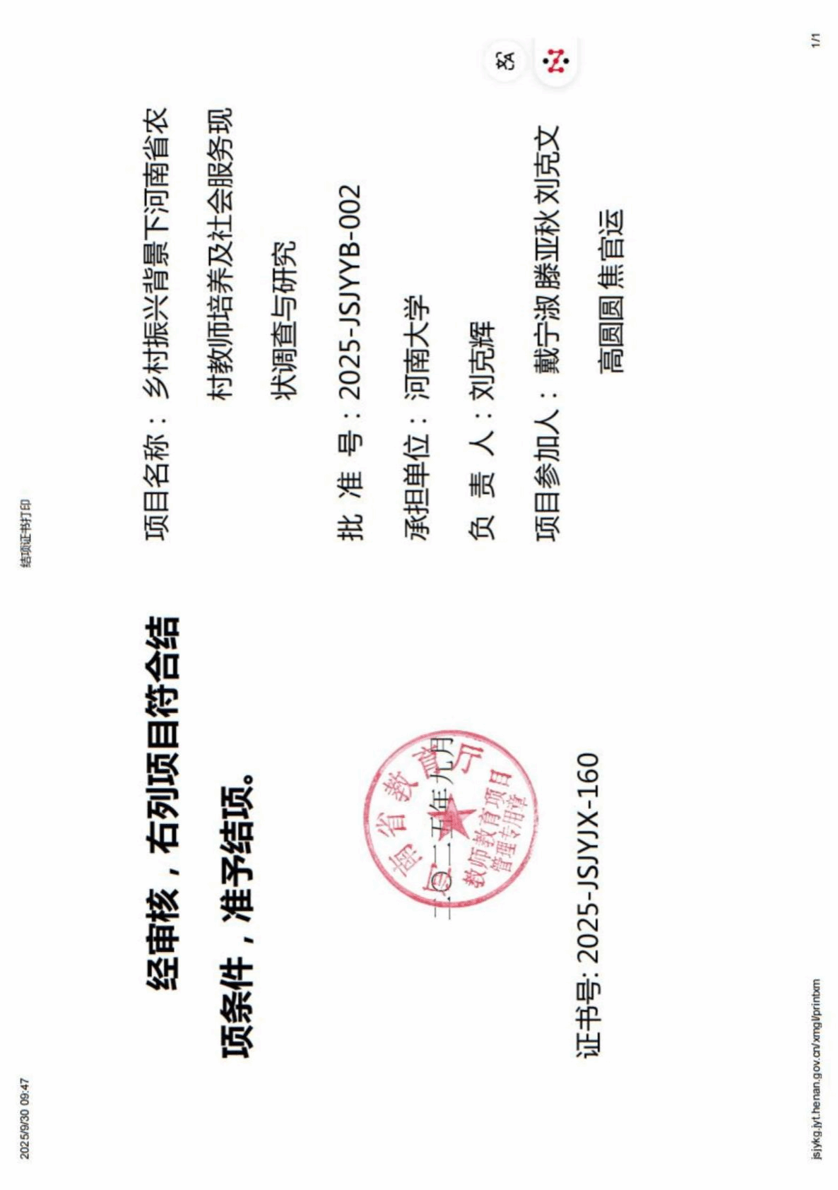 “乡村振兴背景下河南省农村教师培养及社会服务现状调查与研究”项目结项